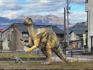 駅舎を出ると、いきなり恐竜がお出迎え。田舎感が拭えない光景は素敵だし、喧噪を忘れさせてくれる。